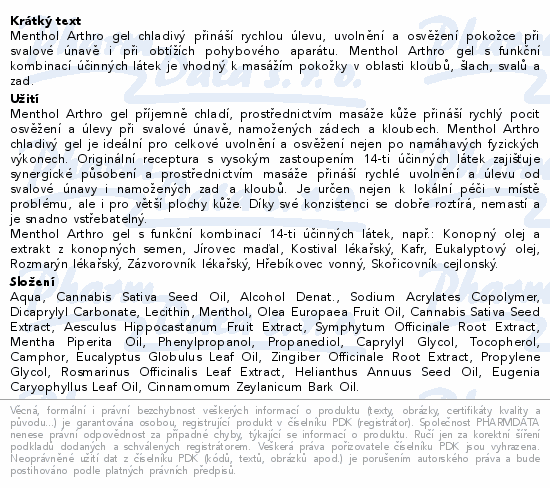 Menthol Arthro gel chladivý přináší rychlou úlevu, uvolnění a osvěžení pokožce při svalové únavě i při obtížích pohybového aparátu. Menthol Arthro gel s funkční kombinací účinných látek je vhodný k masážím pokožky v oblasti kloubů, šlach, svalů a zad.