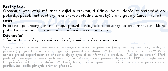 Obsahuje kafr, který má znecitlivující a prokrvující účinky. Velmi dobře se vstřebává do pokožky, působí antisepticky (ničí choroboplodné zárodky) a analgeticky (znecitlivující).