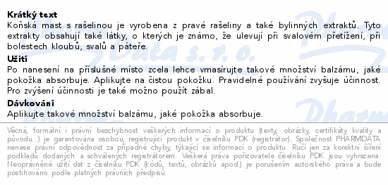 Koňská mast s rašelinou je vyrobena z pravé rašeliny a také bylinných extraktů. Tyto extrakty obsahují také látky, o kterých je známo, že ulevují při svalovém přetížení, při bolestech kloubů, svalů a páteře.