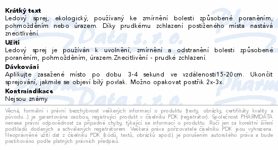 Ledový sprej, ekologický, používaný ke zmírnění bolesti způsobené poraněním, pohmožděním nebo úrazem. Díky prudkému zchlazení postiženého místa nastává znecitlivění.