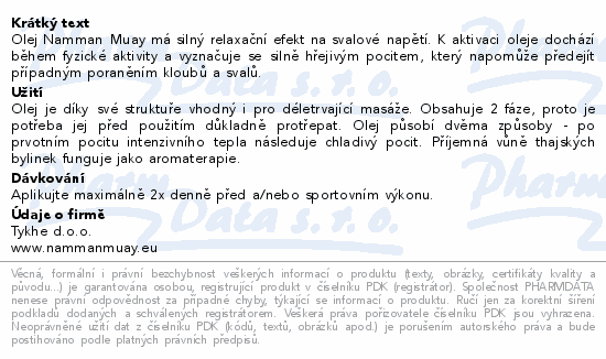 Olej Namman Muay má silný relaxační efekt na svalové napětí. K aktivaci oleje dochází během fyzické aktivity a vyznačuje se silně hřejivým pocitem, který napomůže předejít případným poraněním kloubů a svalů.