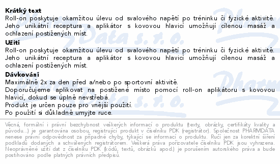 Roll-on poskytuje okamžitou úlevu od svalového napětí po tréninku či fyzické aktivitě. Jeho unikátní receptura a aplikátor s kovovou hlavicí umožňují cílenou masáž a ochlazení postižených míst.
