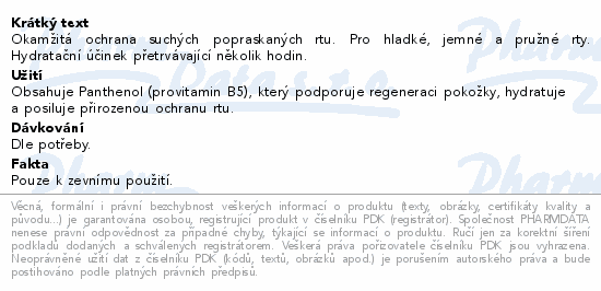 Okamžitá ochrana suchých popraskaných rtu. Pro hladké, jemné a pružné rty. Hydratační účinek přetrvávající několik hodin.
