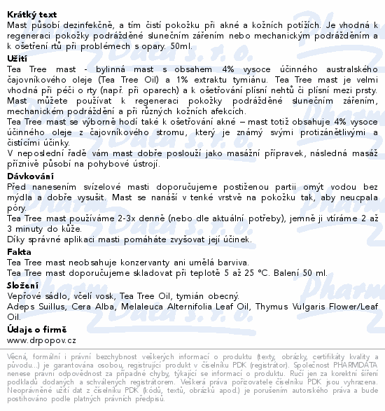 Tea Tree mast Dr. Popov je přírodní bylinná mast s obsahem tea tree oleje, který je známý pro své antiseptické a čisticí účinky. Mast je určena k péči o problematickou nebo podrážděnou pokožku. Využívá se například při akné, oparech, drobných poraněních, štípnutí hmyzem, opruzeninách nebo podráždění po holení.