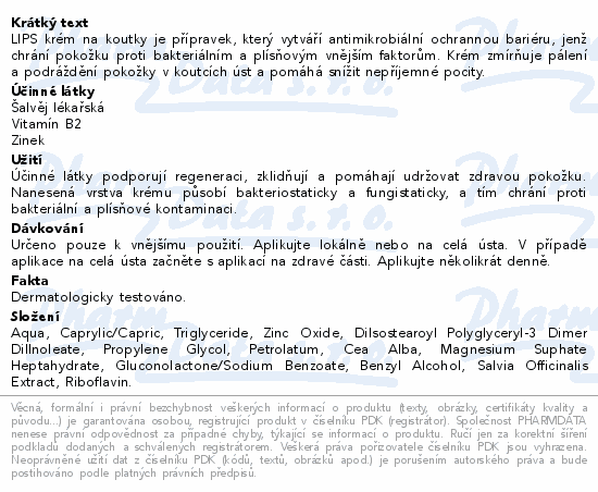 LIPS krém na koutky je přípravek, který vytváří antimikrobiální ochrannou bariéru, jenž chrání pokožku proti bakteriálním a plísňovým vnějším faktorům. Krém zmírňuje pálení a podráždění pokožky v koutcích úst a pomáhá snížit nepříjemné pocity.