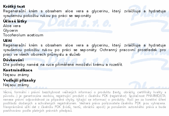 Regenerační krém s obsahem aloe vera a glycerinu, který zvláčňuje a hydratuje vysušenou pokožku rukou po práci se saponáty.