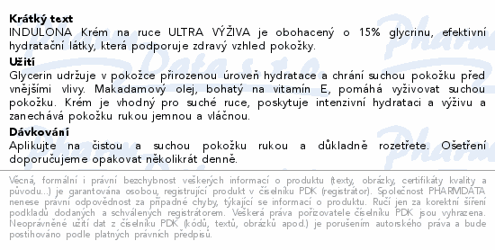 INDULONA Krém na ruce ULTRA VÝŽIVA je obohacený o 15% glycrinu, efektivní hydratační látky, která podporuje zdravý vzhled pokožky.