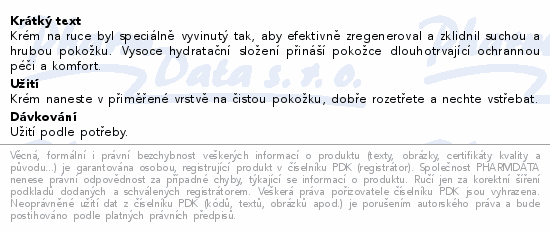 Krém na ruce byl speciálně vyvinutý tak, aby efektivně zregeneroval a zklidnil suchou a hrubou pokožku. Vysoce hydratační složení přináší pokožce dlouhotrvající ochrannou péči a komfort.
