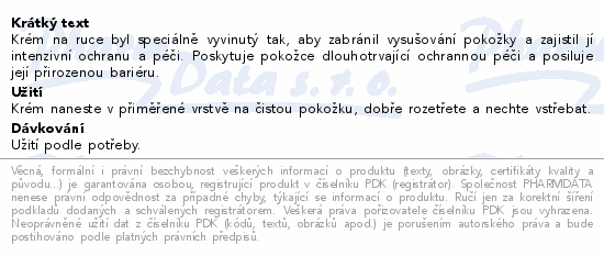 Krém na ruce byl speciálně vyvinutý tak, aby zabránil vysušování pokožky a zajistil jí intenzivní ochranu a péči. Poskytuje pokožce dlouhotrvající ochrannou péči a posiluje její přirozenou bariéru.