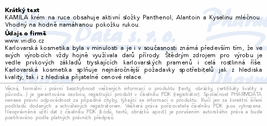 KAMILA krém na ruce obsahuje aktivní složky Panthenol, Alantoin a Kyselinu mléčnou. Vhodný na hodně namáhanou pokožku rukou.