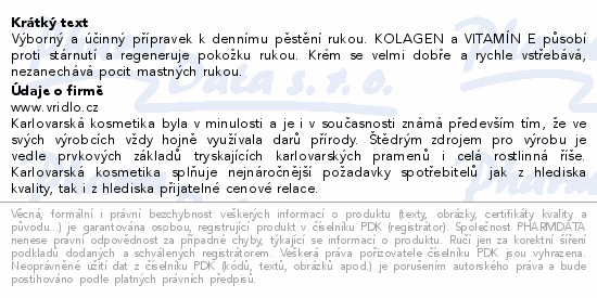 Výborný a účinný přípravek k dennímu pěstění rukou. KOLAGEN a VITAMÍN E působí proti stárnutí a regeneruje pokožku rukou. Krém se velmi dobře a rychle vstřebává, nezanechává pocit mastných rukou.