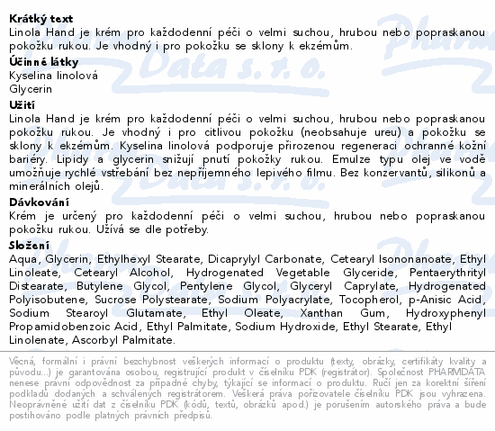 Linola Hand je krém pro každodenní péči o velmi suchou, hrubou nebo popraskanou pokožku rukou. Je vhodný i pro pokožku se sklony k ekzémům.