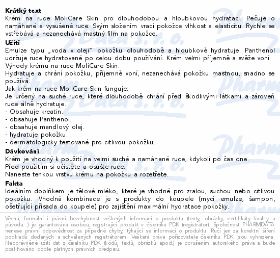 Krém na ruce MoliCare Skin pro dlouhodobou a hloubkovou hydrataci. Pečuje o namáhané a vysušené ruce. Svým složením vrací pokožce vlhkost a elasticitu. Rychle se vstřebává a nezanechává mastný film na pokožce.