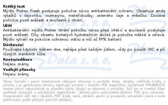 Mýdlo Protex Fresh poskytuje pokožce rukou antibakteriální ochranu. Obsahuje směs výtažků z čajovníku, rozmarýnu, mateřídoušky, zeleného čaje a měsíčku. Dodává pokožce pocit svěžesti a současně ji chrání.
