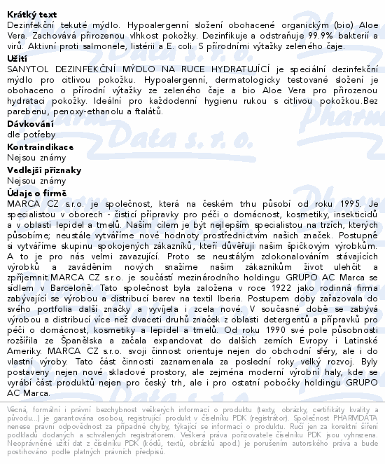 Dezinfekční tekuté mýdlo. Hypoalergenní složení obohacené organickým (bio) Aloe Vera. Zachovává přirozenou vlhkost pokožky. Dezinfikuje a odstraňuje 99.9% bakterií a virů. Aktivní proti salmonele, listérii a E. coli. S přírodními výtažky zeleného čaje.