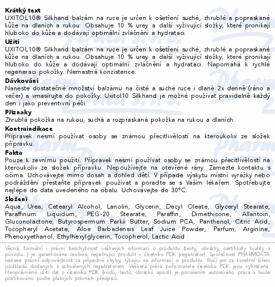 UXITOL10® Silkhand balzám na ruce je určen k ošetření suché, zhrublé a popraskané kůže na dlaních a rukou. Obsahuje 10 % urey a další vyživující složky, které pronikají hluboko do kůže a dodávají optimální zvláčnění a hydrataci.