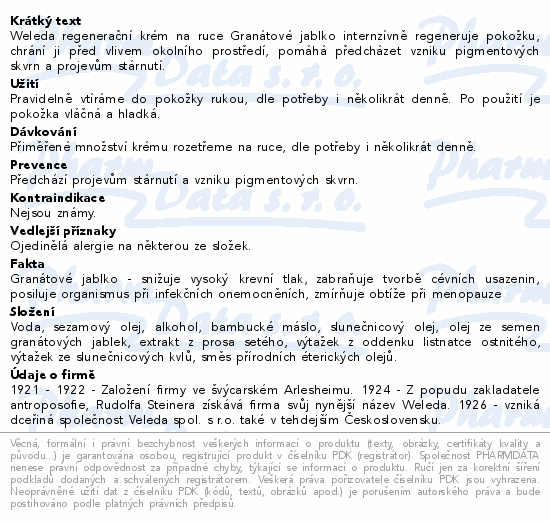 Weleda regenerační krém na ruce Granátové jablko internzívně regeneruje pokožku, chrání ji před vlivem okolního prostředí, pomáhá předcházet vzniku pigmentových skvrn a projevům stárnutí.