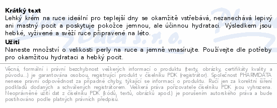 Lehký krém na ruce ideální pro teplejší dny se okamžitě vstřebává, nezanechává lepivý ani mastný pocit a poskytuje pokožce jemnou, ale účinnou hydrataci. Výsledkem jsou hebké, vyživené a svěží ruce připravené na léto.