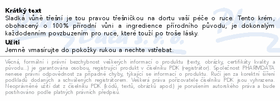 Sladká vůně třešní je tou pravou třešničkou na dortu vaší péče o ruce. Tento krém, obohacený o 100% přírodní vůni a ingredience přírodního původu, je dokonalým každodenním povzbuzením pro ruce, které touží po troše lásky.