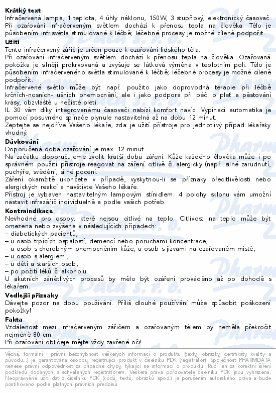 Infračervená lampa, 1 teplota, 4 úhly náklonu, 150W, 3 stupňový, elektronický časovač. Při ozařování infračerveným světlem dochází k přenosu tepla na člověka. Tělo je působením infr.světla stimulované k léčbě; léčebné procesy je možné cíleně podpořit.