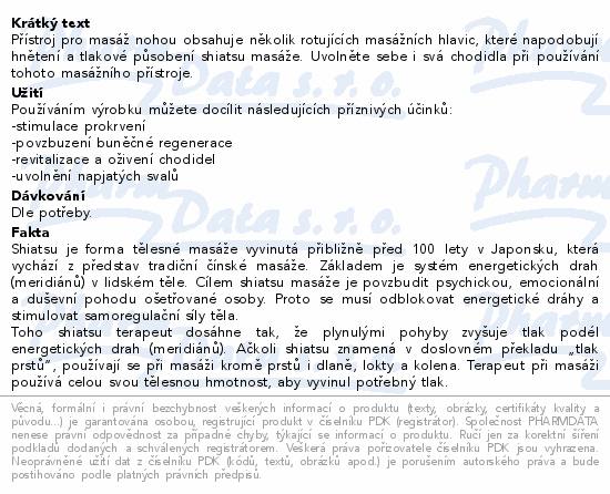 Přístroj pro masáž nohou obsahuje několik rotujících masážních hlavic, které napodobují hnětení a tlakové působení shiatsu masáže. Uvolněte sebe i svá chodidla při používání tohoto masážního přístroje.