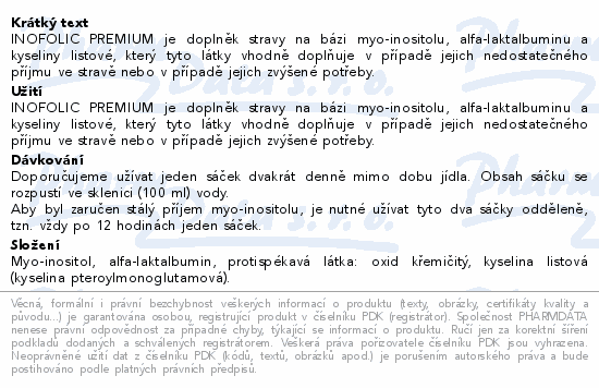 INOFOLIC PREMIUM je doplněk stravy na bázi myo-inositolu, alfa-laktalbuminu a kyseliny listové, který tyto látky vhodně doplňuje v případě jejich nedostatečného příjmu ve stravě nebo v případě jejich zvýšené potřeby.