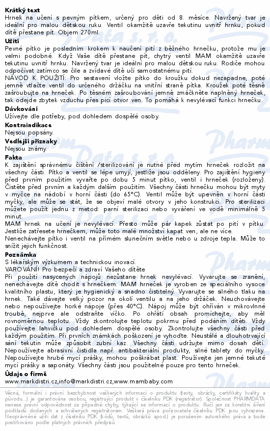 Hrnek na učení s pevným pítkem, určený pro děti od 8. měsíce. Navržený tvar je ideální pro malou dětskou ruku. Ventil okamžitě uzavře tekutinu uvnitř hrnku, pokud dítě přestane pít. Objem 270ml.