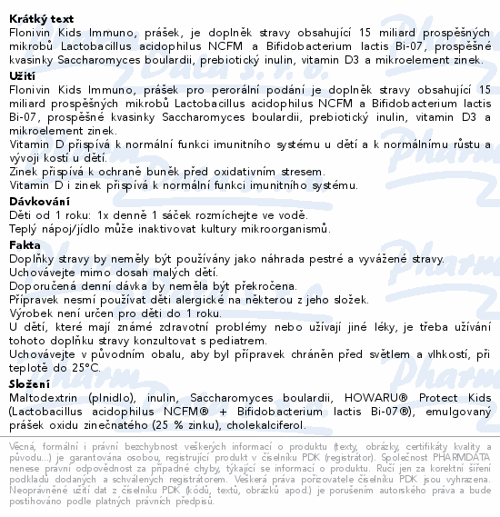 Flonivin Kids Immuno, prášek, je doplněk stravy obsahující 15 miliard prospěšných mikrobů Lactobacillus acidophilus NCFM a Bifidobacterium lactis Bi-07, prospěšné kvasinky Saccharomyces boulardii, prebiotický inulin, vitamin D3 a mikroelement zinek.