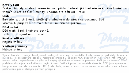 Žvýkací tablety s jahodovo-malinovou příchutí obsahující bakterie mléčného kvašení a vitamín D pro posílení imunity. Vhodné pro děti od 1 roku.
