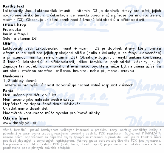 Laktobacily Jack Laktobacilák Imunit + vitamin D3 je doplněk stravy pro děti, jejich spokojené bříško (inulin z čekanky, silice fenyklu obecného) a přirozenou imunitu (selen, vitamin D3). Obsahuje unikátní kombinaci 5 kmenů laktobacilů a bifidobakterií.