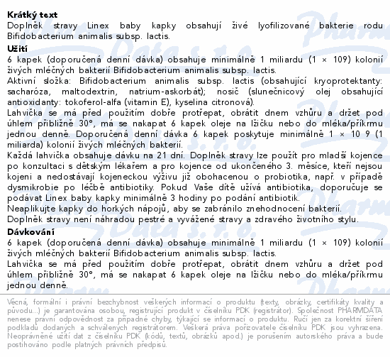 Doplněk stravy Linex baby kapky obsahují živé lyofilizované bakterie rodu Bifidobacterium animalis subsp. lactis.
