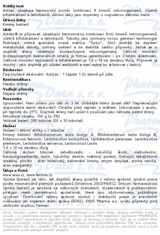 Actilac obsahuje harmonický poměr kombinací 8 kmenů mikroorganismů. Včetně bifidobakterií a laktobacilů. Aktivní látky jsou doplněny o rozpustnou vlákninu inulin.