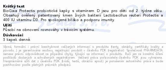 BioGaia Protectis probiotické kapky s vitamínem D jsou pro děti od 2. týdne věku. Obsahují ověřený patentovaný kmen živých bakterií Lactobacillus reuteri Protectis a 400 IU vitamínu D3. Pro spokojené bříško a podporu imunity.