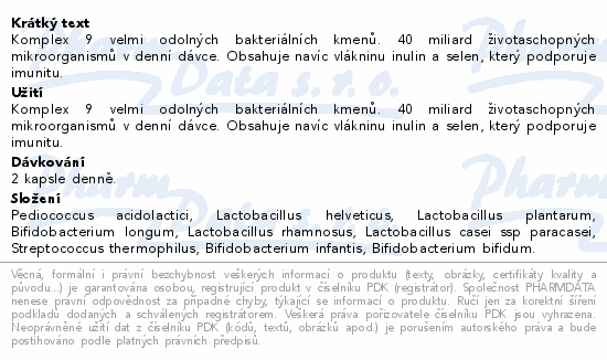Komplex 9 velmi odolných bakteriálních kmenů. 40 miliard životaschopných mikroorganismů v denní dávce. Obsahuje navíc vlákninu inulin a selen, který podporuje imunitu.