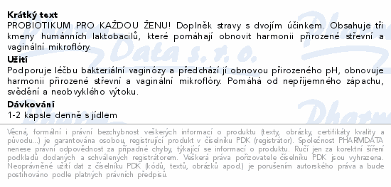 Doplněk stravy s dvojím účinkem, probiotikum pro ženy. Obsahuje tři kmeny humánních laktobacilů, které pomáhají obnovit harmonii přirozené střevní a vaginální mikroflóry.