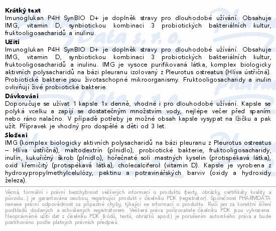 Imunoglukan P4H SynBIO D+ je doplněk stravy pro dlouhodobé užívání. Obsahuje IMG, vitamin D, synbiotickou kombinaci 3 probiotických bakteriálních kultur, fruktooligosacharidů a inulinu.