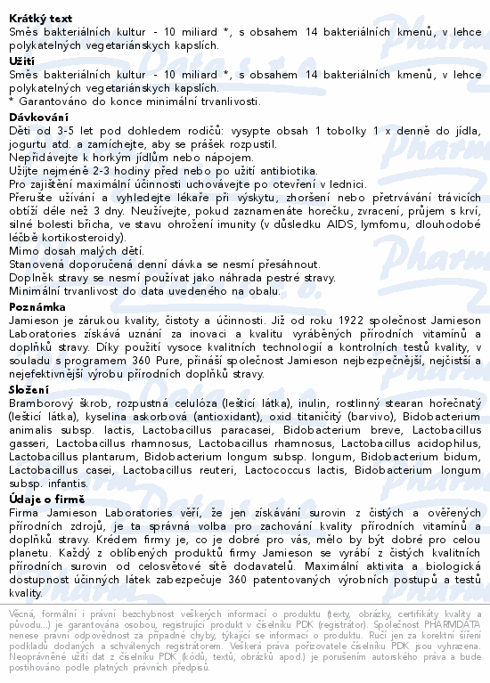 Směs bakteriálních kultur - 10 miliard *, s obsahem 14 bakteriálních kmenů, v lehce polykatelných vegetariánskych kapslích.
