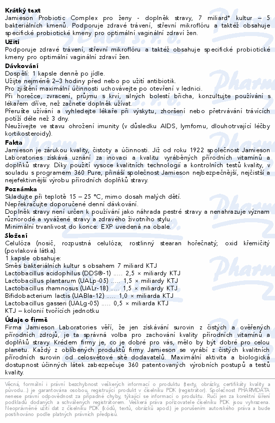 Jamieson Probiotic Complex pro ženy - doplněk stravy, 7 miliard* kultur – 5 bakteriálních kmenů. Podporuje zdravé trávení, střevní mikroflóru a taktéž obsahuje specifické probiotické kmeny pro optimální vaginální zdraví žen.