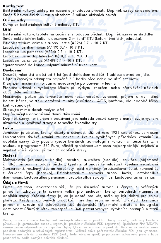 Bakteriální kultury, tablety na cucání s jahodovou příchutí. Doplněk stravy se sladidlem. Směs 5 bakteriálních kultur s obsahem 2 miliard aktivních baktérií.