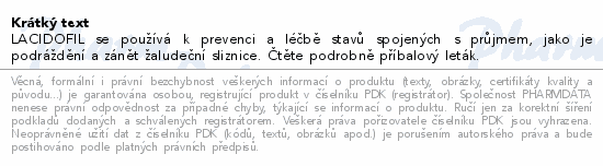 LACIDOFIL obsahuje mléčné bakterie (Lactobacillus), které jsou normálně přítomny ve střevech a jsou důležité pro normální průběh trávení, ochranu proti nežádoucím druhům střevních bakterií a tvorbu určitých vitamínů skupiny B a jiných ochranných látek. LACIDOFIL se používá k prevenci a léčbě stavů spojených s průjmem, jako je podráždění a zánět žaludeční sliznice. Přípravek mohou užívat děti, mladiství i dospělí.