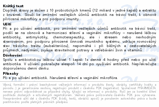 Doplněk stravy je složen z 10 probiotických kmenů (12 miliard v jedné kapsli) a extraktu z brusinek. Slouží ke zmírnění vedlejších účinků antibiotik na trávicí trakt, k obnově přirozené mikroflóry a pro podporu imunity.