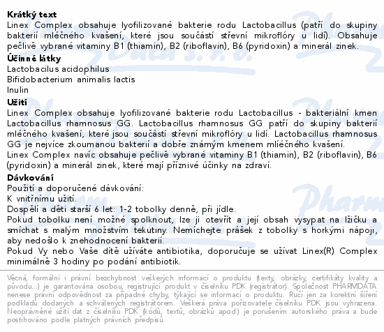 Linex Complex obsahuje lyofilizované bakterie rodu Lactobacillus (patří do skupiny bakterií mléčného kvašení, které jsou součástí střevní mikroflóry u lidí). Obsahuje pečlivě vybrané vitaminy B1 (thiamin), B2 (riboflavin), B6 (pyridoxin) a minerál zinek.