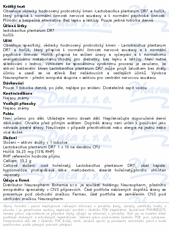 Obsahuje vědecky hodnocený probiotický kmen -Lactobacillus plantarum DR7 a hořčík, který přispívá k normální činnosti nervové soustavy a k normální psychické činnosti. Přírodní a bezpečná alternativa. Bez lepku a laktózy. Pouze jediná tobolka denně.