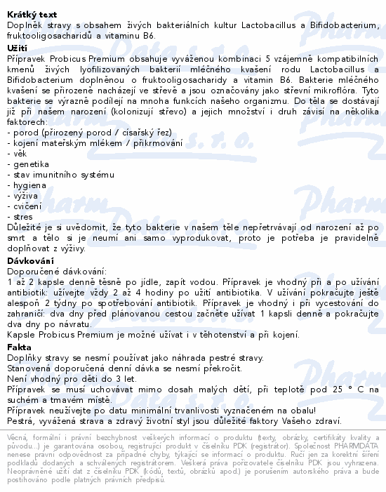Doplněk stravy s obsahem živých bakteriálních kultur Lactobacillus a Bifidobacterium, fruktooligosacharidů a vitaminu B6.