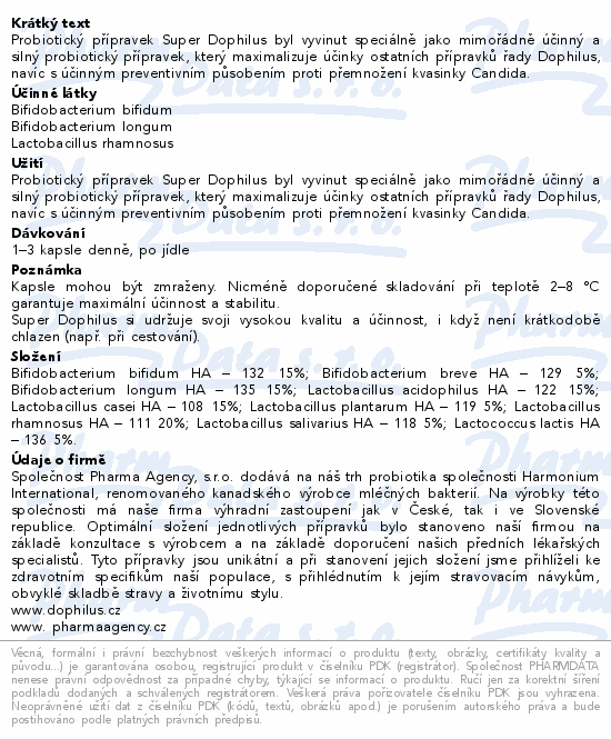 Probiotický přípravek Super Dophilus byl vyvinut speciálně jako mimořádně účinný a silný probiotický přípravek, který maximalizuje účinky ostatních přípravků řady Dophilus, navíc s účinným preventivním působením proti přemnožení kvasinky Candida.