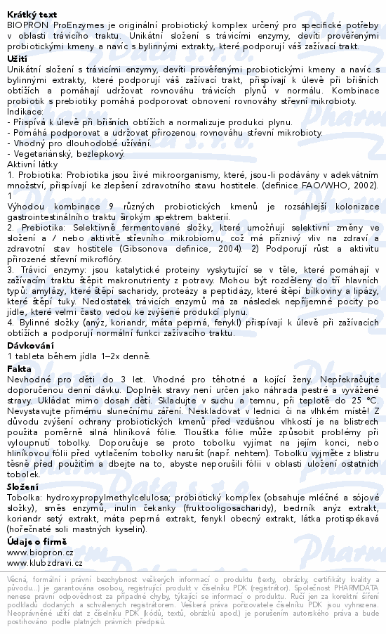 BIOPRON ProEnzymes je originální probiotický komplex určený pro specifické potřeby v oblasti trávicího traktu. Unikátní složení s trávicími enzymy, devíti prověřenými probiotickými kmeny a navíc s bylinnými extrakty, které podporují váš zažívací trakt.