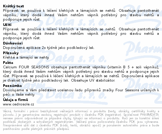 Přípravek se používá k léčení křehkých a lámajících se nehtů. Obsahuje pantothenát vápníku, který dodá ihned Vašim nehtům vápník potřebný pro stavbu nehtů a podporuje jejich růst.