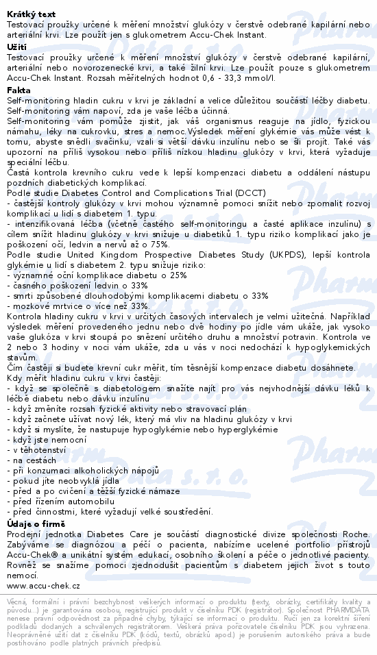 Testovací proužky určené k měření množství glukózy v čerstvě odebrané kapilární nebo arteriální krvi. Lze použít jen s glukometrem Accu-Chek Instant.