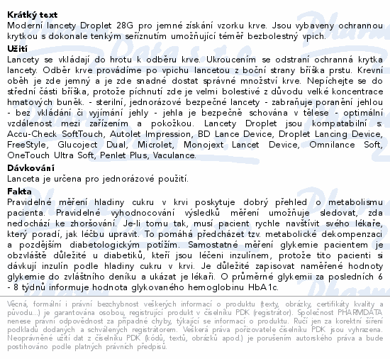 Moderní lancety Droplet 28G pro jemné získání vzorku krve. Jsou vybaveny ochrannou krytkou s dokonale tenkým seříznutím umožňující téměř bezbolestný vpich.