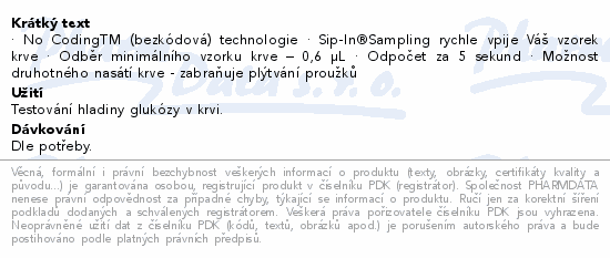 · No CodingTM (bezkódová) technologie · Sip-In®Sampling rychle vpije Váš vzorek krve · Odběr minimálního vzorku krve – 0,6 µL · Odpočet za 5 sekund · Možnost druhotného nasátí krve - zabraňuje plýtvání proužků